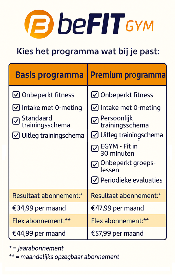 Bij BeFit Gym kun jij kiezen voor een passend abonnement dat geheel aansluit op jouw doelstelling.